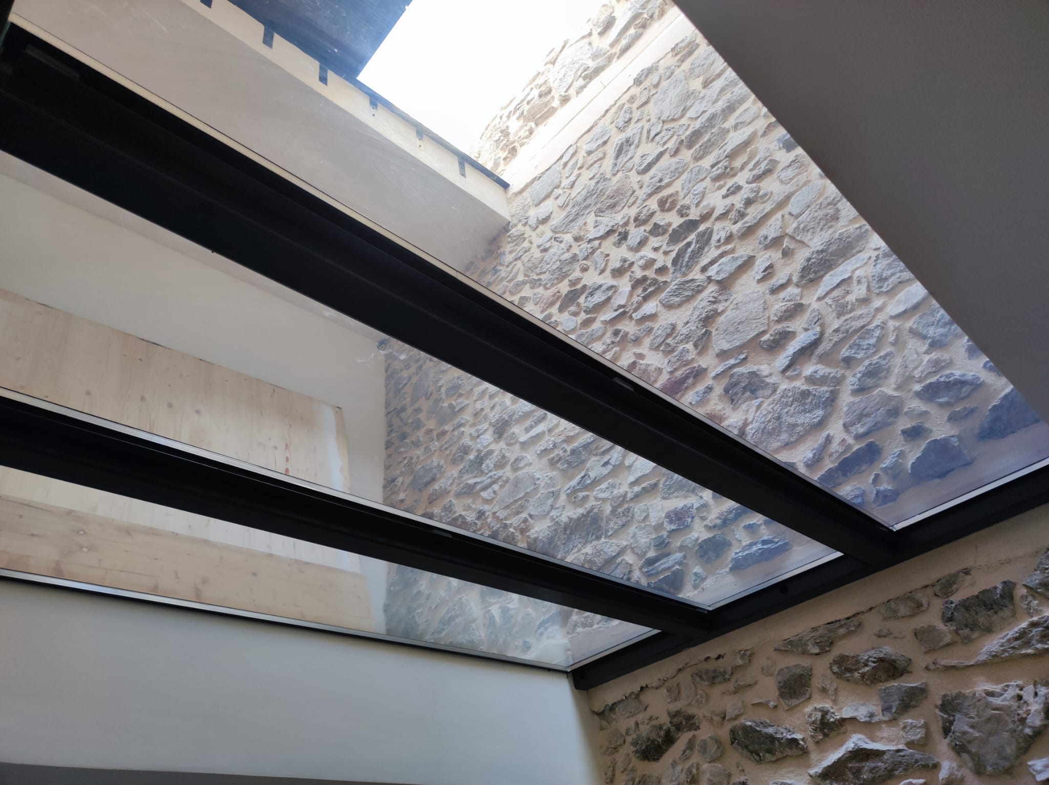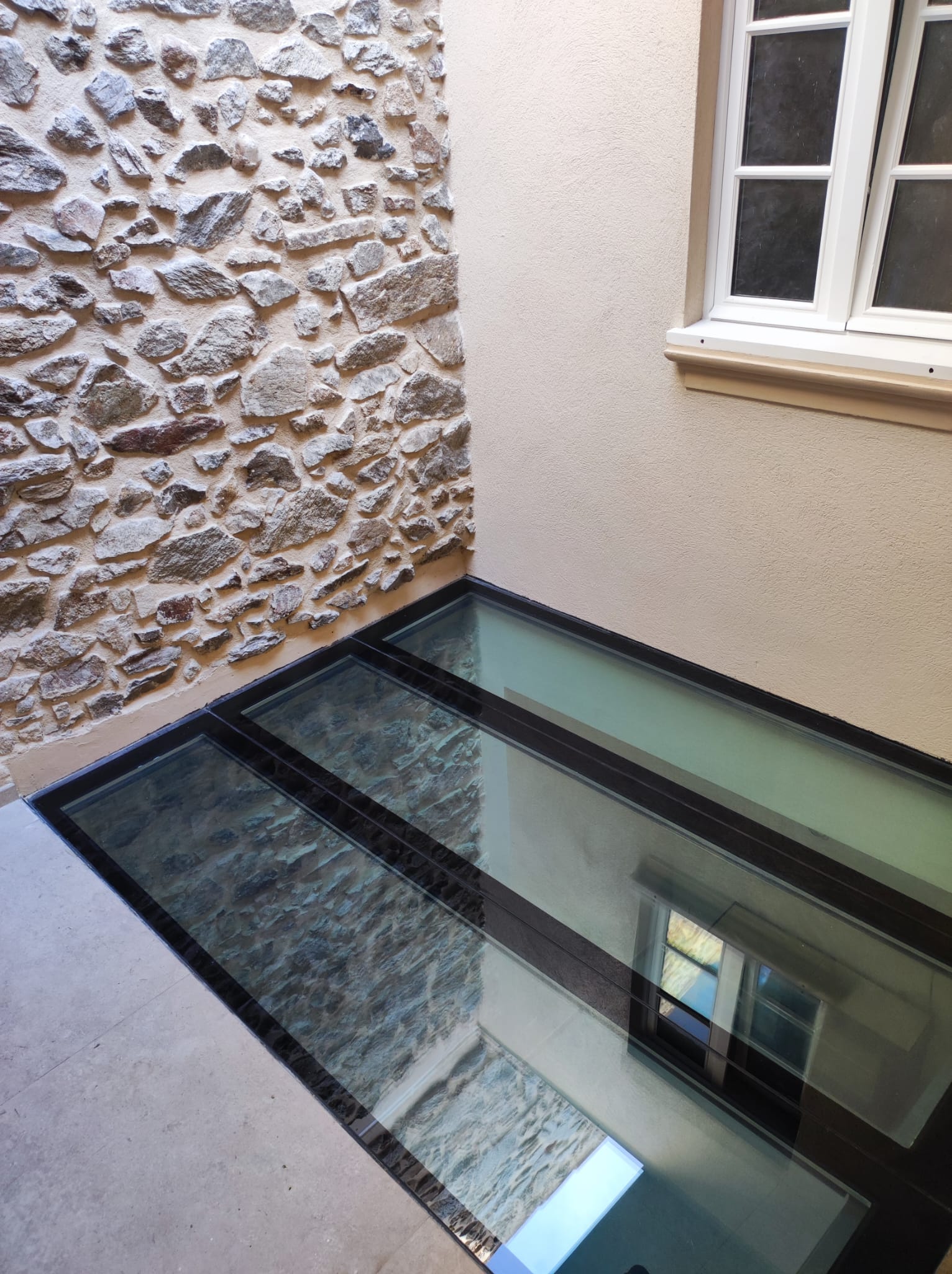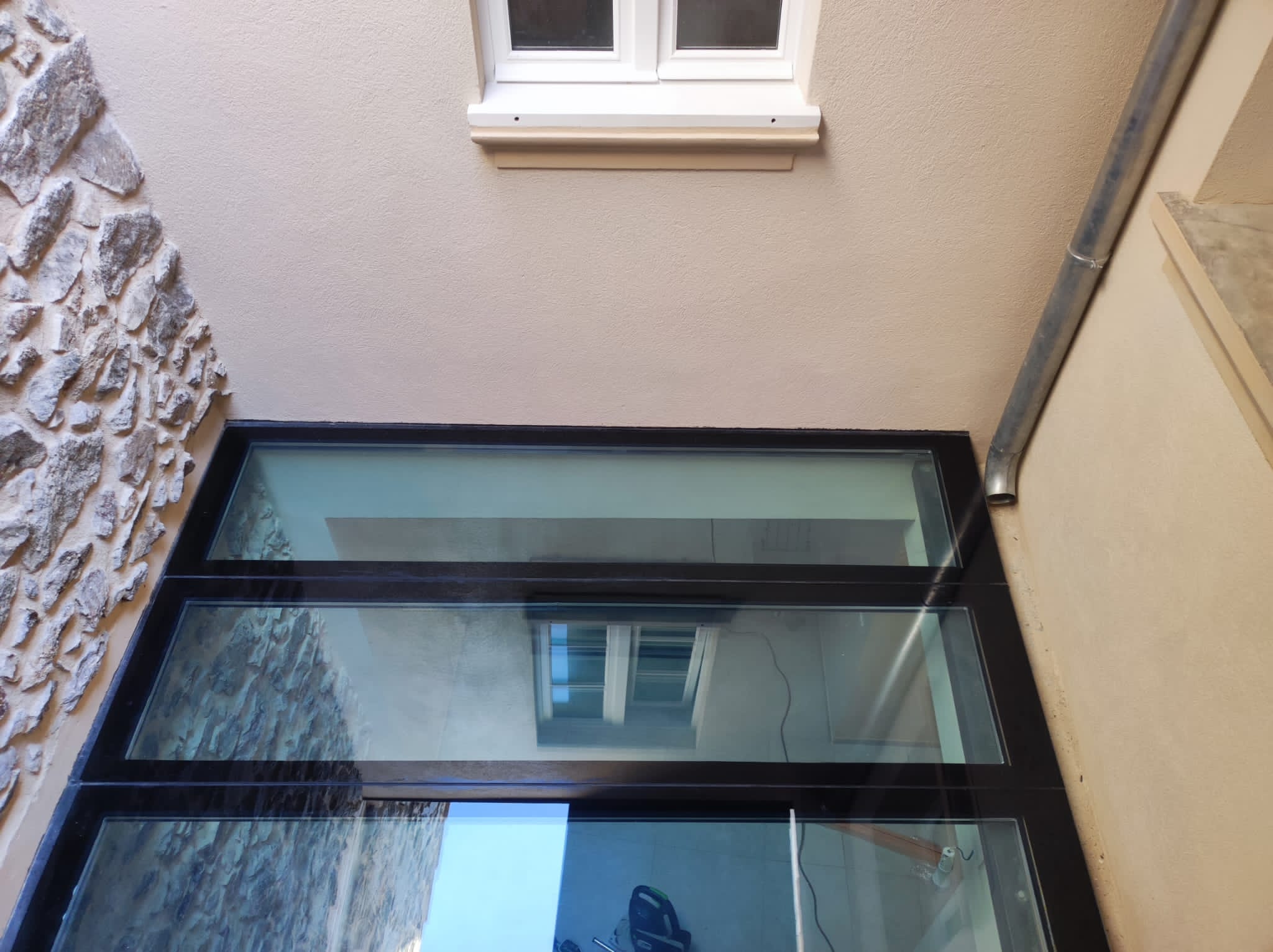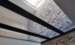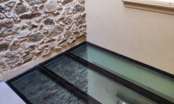Le but était de clore le rez-de-chaussée afin d'insonoriser les étages supérieurs de celui-ci des bruits des machines de coutures, tout en préservant la lumière naturelle. La solution idéale qui s'est imposée est un plancher en verre ! De plus, ce projet peut également servir de terrasse pour l’appartement du premier étage